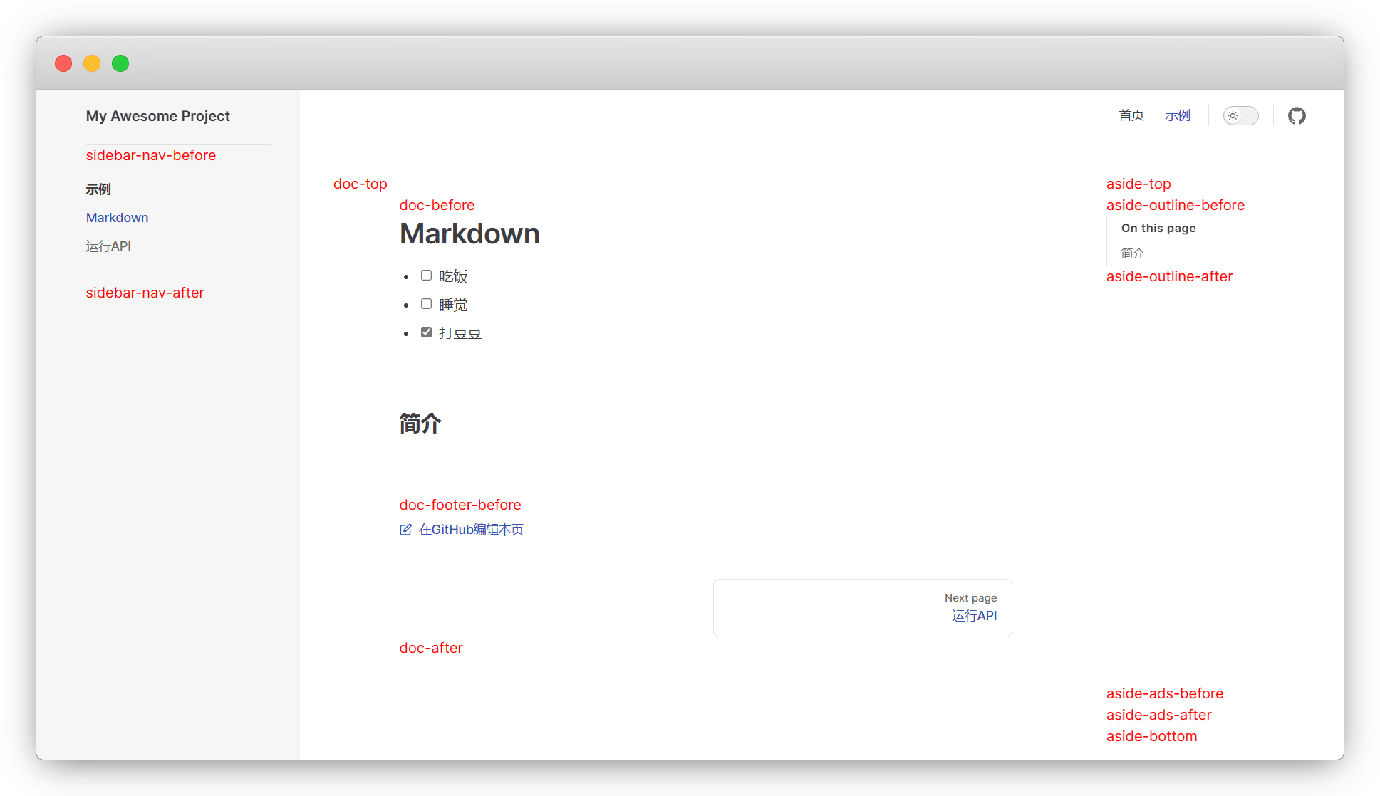 //'doc-before': () => h(MyLayout2), // 第2个组件使用doc-before插槽