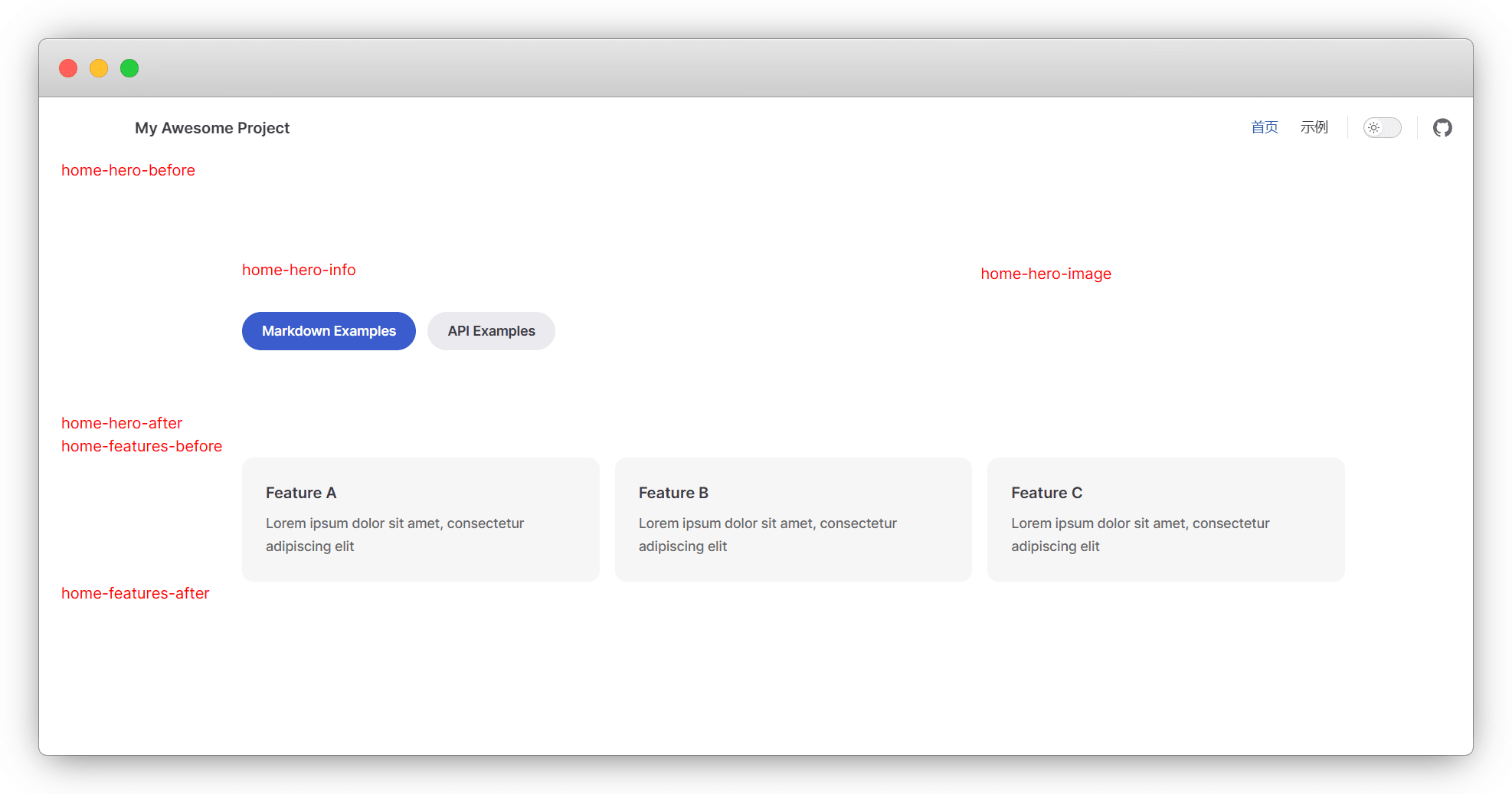 当 Frontmatter 配置 layout: home (默认)时插槽及位置